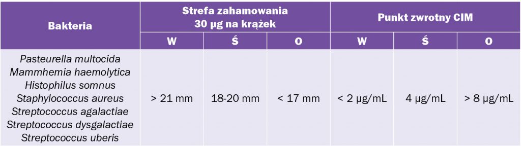 Tab. 1 przedstawia wartości klinicznego punktu zwrotnego ustanowione przez organizacje międzynarodowe dla patogenów bydła w odniesieniu do ceftiofuru, jako przykładu środka przeciwbakteryjnego z rodziny beta-laktamów.